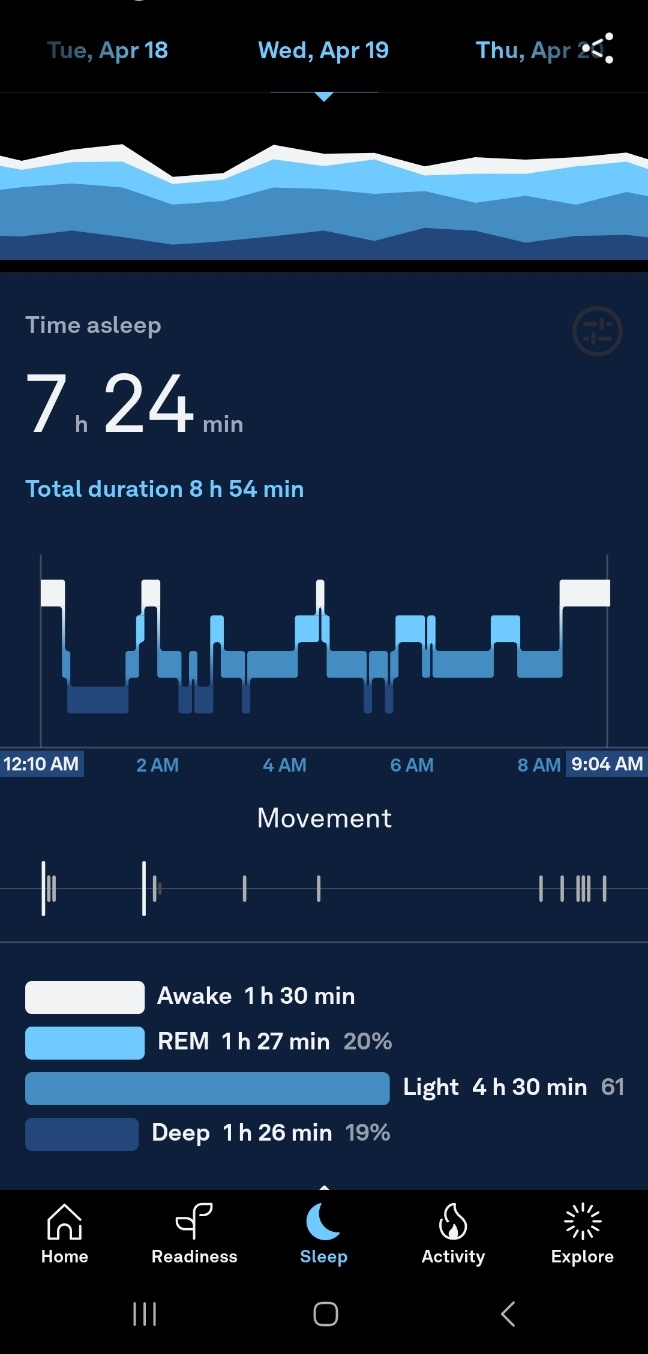 아마 일어날 때 침대에서 바로 일어나지 못하고 뒹구르르 하느라 깨어있는 시간이 높았던 것 같다. 그러나.. 중요한 것은 딥슬립 사이에 있는 Awake.