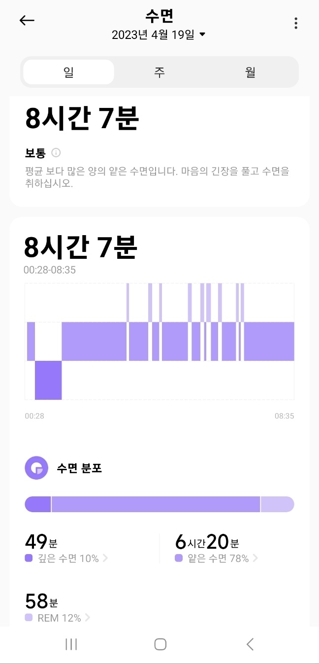 얕은수면은 6시간 20분, 오우라링 스마트 밴드와는 2시간 차이이다.